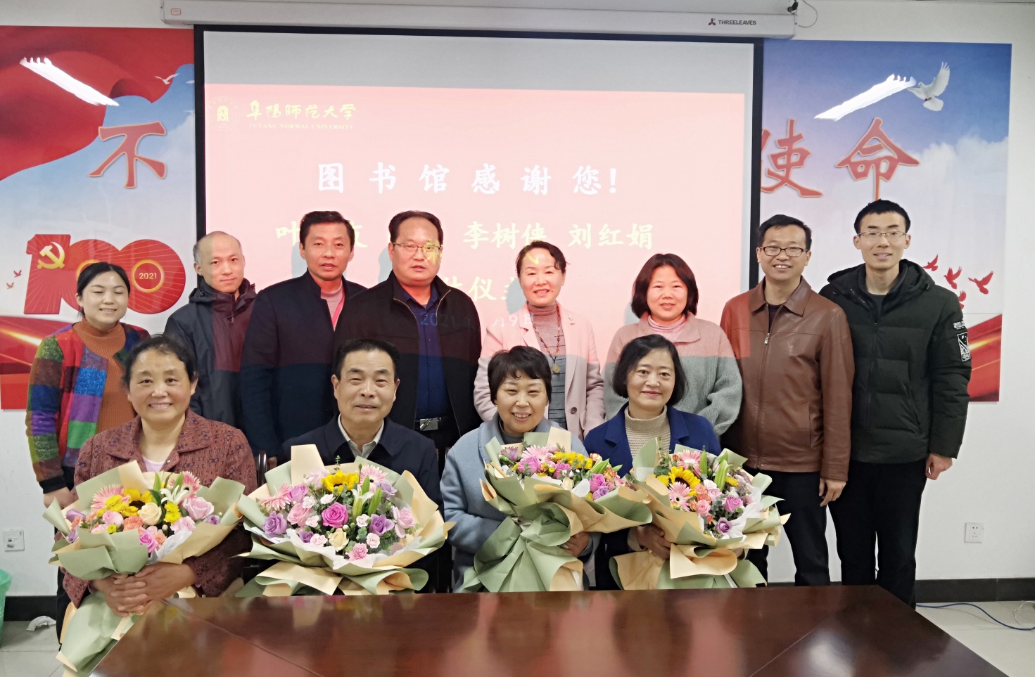 会议伊始,梁长武和王申红代表图书馆为4位老师赠送了荣休纪念品和献花。