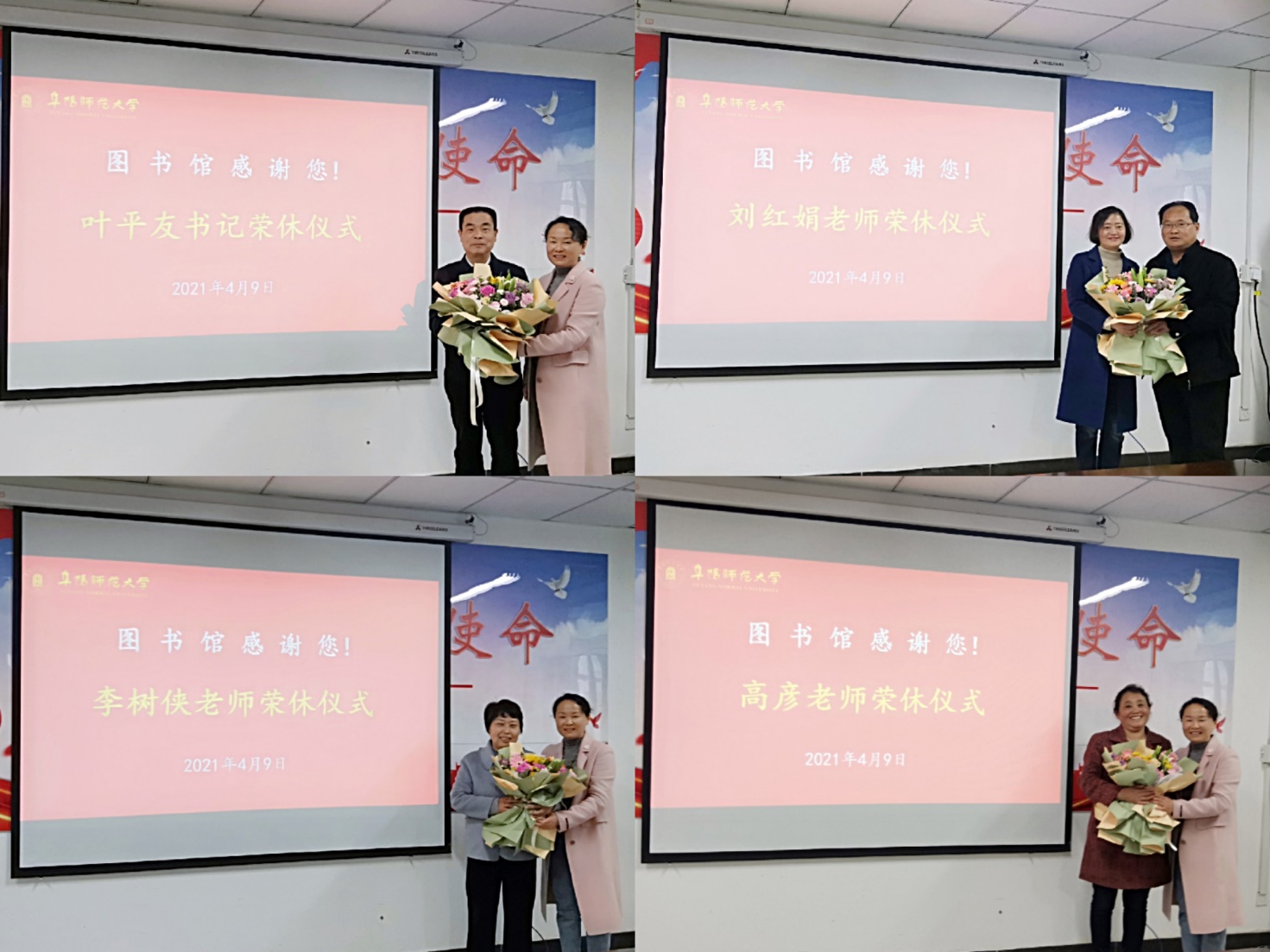 4月9日上午,图书馆在西湖校区正行楼313室为近期退休的叶平友、高彦、李树侠、刘红娟等4位老师举行了荣休仪式。图书馆党总支书记梁长武、馆长王申红及4位退休馆员的部门同事代表出席了荣休仪式。仪式由图书馆工会主席蒋自奎主持。