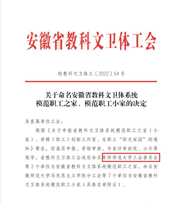 据悉:本次模范职工之家和小家评选,省属高校广泛参与,经基层申报、资格审查、专家评审验收、公示等程序,省教科文卫体工会决定命名阜阳师范大学工会委员会等 2 个单位为安徽省教科文卫体系统模范职工之家,命名安徽师范大学马克思主义学院分工会等 7 个单位为安徽省教科文卫体系统模范职工小家。