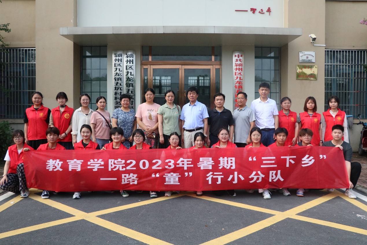 7月3日下午,校工会和离退休工作处党支部赴颍州区九龙镇五坑村开展主题党日活动、慰问驻村干部,教育学院领导老师同行看望暑期“三下乡”志愿服务同学。
