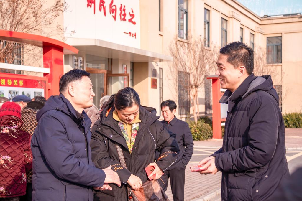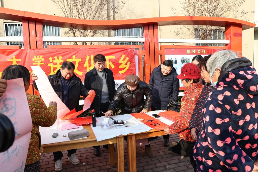 在五坑村,学校与安徽省高校书法协会阜阳工作站联合开展的送文化下乡活动现场,涂红松与为村民们书写春联的书法老师们进行了交谈,对他们不辞辛苦,为村民带来“精神食粮”表示感谢,称赞活动的开展,大力弘扬了中华民族优秀传统文化,进一步营造了新春佳节和谐美好的节日氛围,提升了广大群众的幸福感和获得感。
