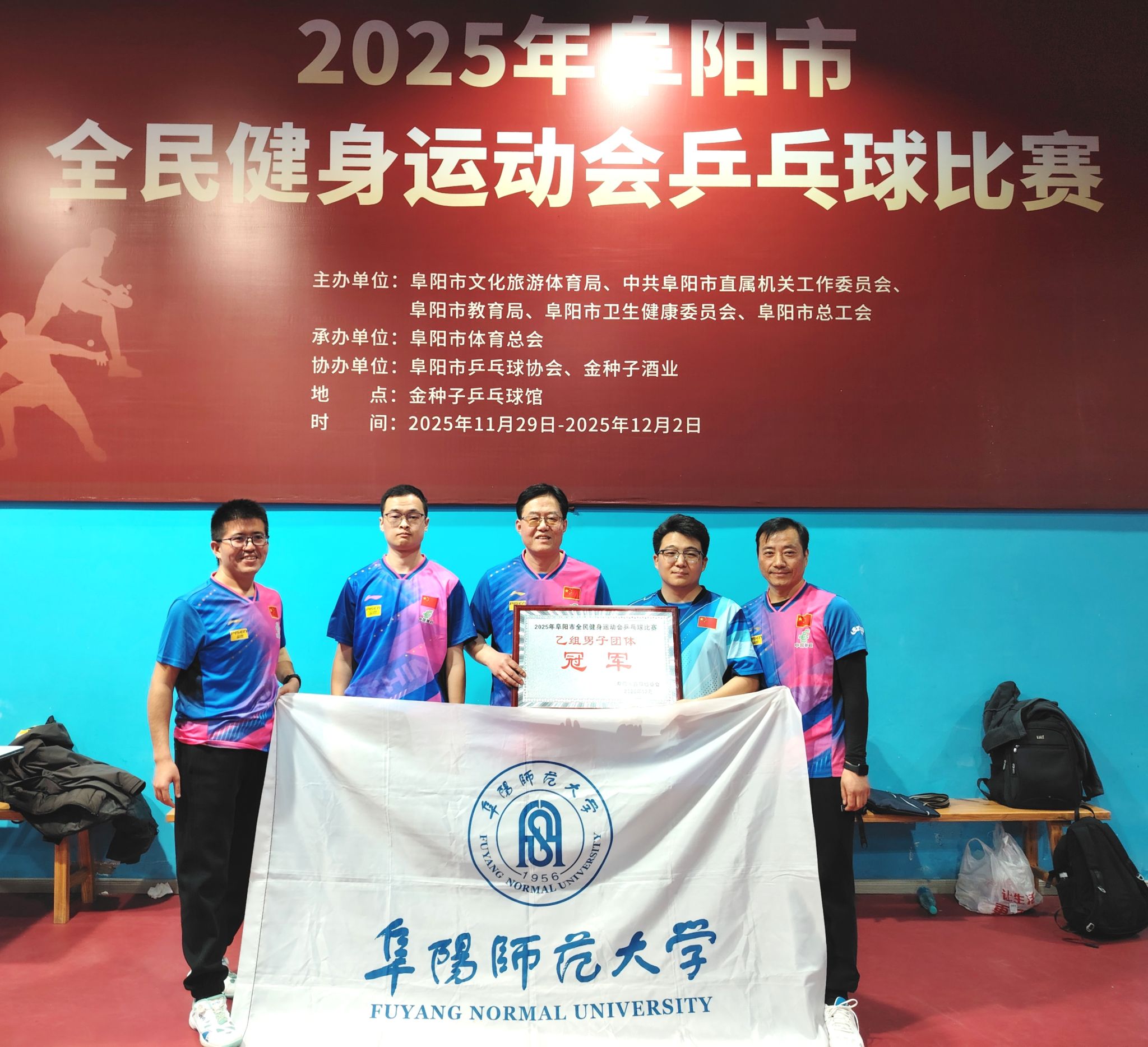 近日,2025年阜阳市全民健身运动会乒乓球团体赛在金种子集团职工乒乓球馆圆满落幕。我校教职工张宏、王志刚、王重光、张阳、李伟沙组成的代表队,在强手如林的赛场上奋勇拼搏、默契协作,最终力克群雄,成功摘得本次比赛团体冠军。