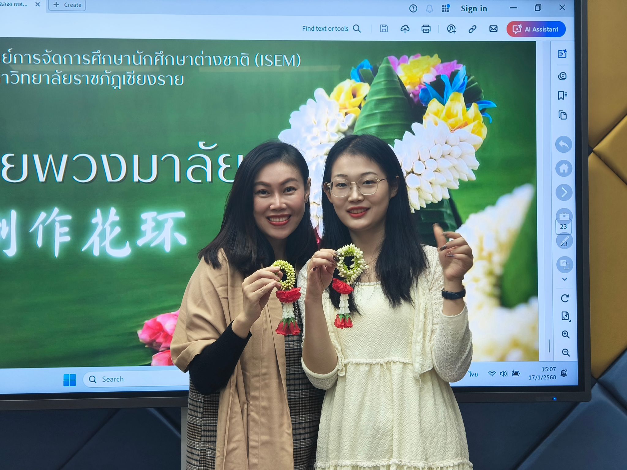 在基础泰语课程中,我们从语音、文字到日常对话进行系统性学习。泰语声调的变化规律(如中调、低调、降调)曾让我倍感挑战,但老师以“语言是文化的密码”为引导,通过对比泰语敬语体系与泰国社会等级观念的关系,帮助我们在语言学习中理解文化逻辑。例如,“ค่ะ”(kha)和“ครับ”(khrap)不仅是性别词尾,更反映了泰国人对社交礼仪的重视。