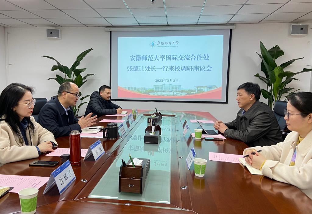 张德让对我校的接待表示感谢,介绍了安徽师范大学的外事工作基本情况及中外合作办学的最新进展,并就新获批的中外合作办学项目实施前的准备环节进行了重点咨询和探讨。两校承办中外合作办学项目的教学学院代表深入交流了中外课程设置、外教聘用与服务、学生管理等方面的思考与举措。