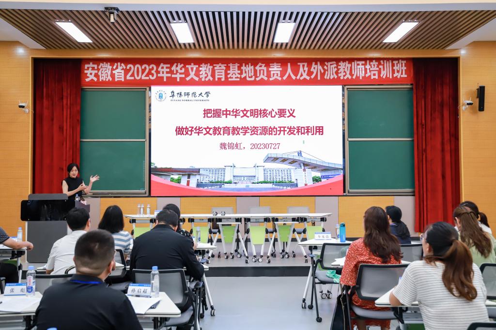 本次培训班由安徽省委统战部主办,阜阳师范大学承办。我校为安徽省省级华文教育基地之一。安徽省华文教育基地是经安徽省侨办和安徽省教育厅批准设立的文化传播平台,是海外华裔青少年学习中文和中华文化、增进对祖(籍)国联系和情感的重要载体,也是推进中外人文交流、促进文明交流互鉴的重要渠道。基地学校坚持需求导向,突出地域特色,打造精品课程,生动展现安徽的历史文化、风光风貌、经济社会发展等情况,增强海外华裔对祖(籍)国的文化认同。