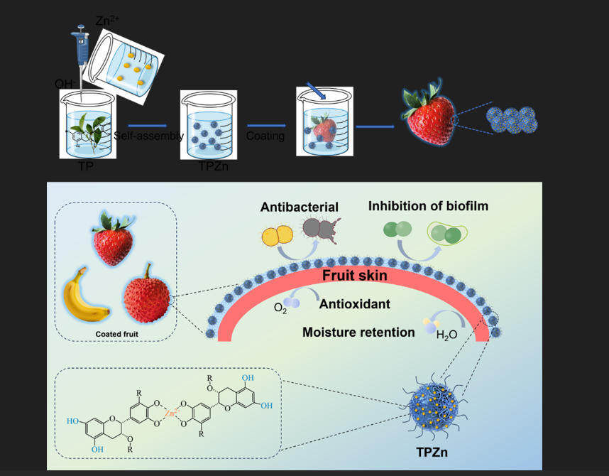 植物天然多酚具有抗氧化、抗菌、抗炎等多种生物活性,部分已被国家批准作为食品添加剂和新资源食品。我国具有丰富的多酚资源,如茶叶、生姜、香椿、水果等都含有多种多酚。但植物多酚羟基结构易受环境因素(如pH、温度等)影响,发生结构改变导致活性丧失,严重限制了其在食品、医药等领域的规模化应用。针对这一问题,研究团队利用组装化学技术,以茶多酚和营养元素锌为原料(均符合食品添加剂使用标准),在水相常温常压下自组装形成结构稳定、功效协同的多酚组装复合物。通过细胞、模式生物(线虫、斑马鱼、小鼠)等多模型实验,验证了多酚复合物的安全性和有效性。进一步作为可食用保鲜涂层应用于香蕉、草莓、荔枝等易腐水果,结果显示能显著延缓果实腐烂、保持营养品质(如花青素、维生素C等),使其保质期延长了一倍。