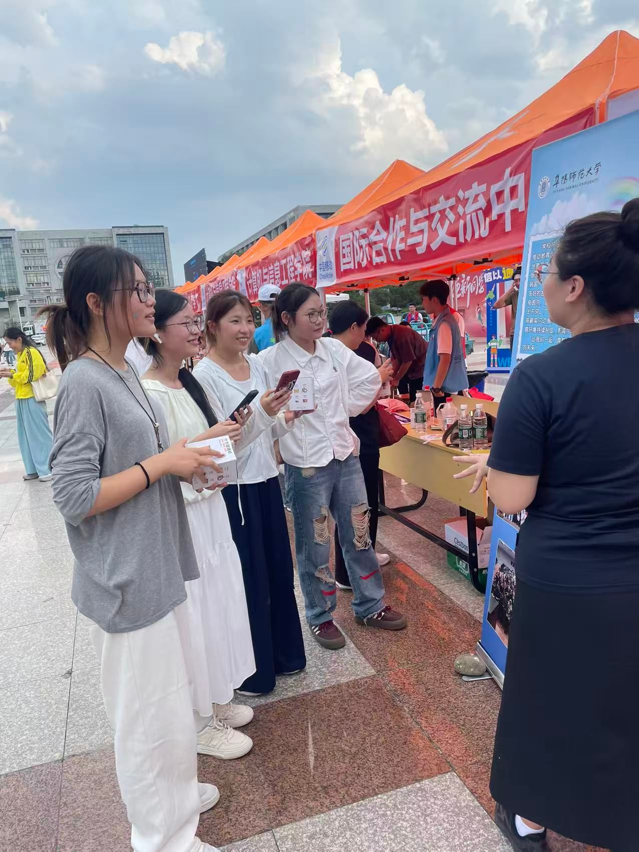 许多新生和家长驻足咨询,工作人员耐心解答有关短期游学、学分置换项目、语言考试支持及国际化素养提升等方面的各类问题,并提供有针对性的建议。中心还贴心准备了矿泉水和精美小礼品,在初秋微热的天气中送去一份清凉与关怀,赢得了新生和家长的广泛好评。