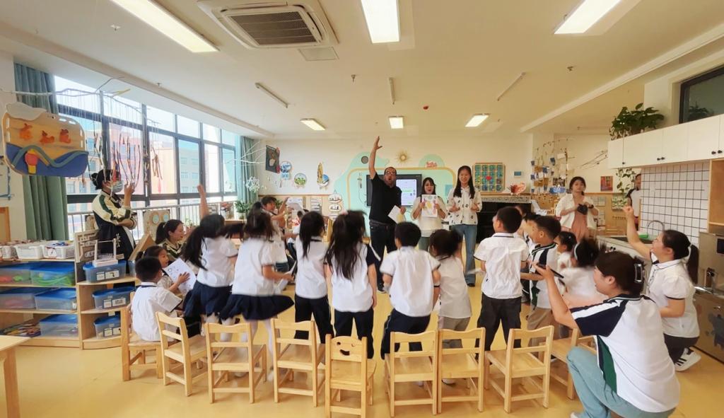 活动伊始,陈雪雁引导师生们一起观看了幼儿园颇具中华传统文化特色的扇舞幼儿早操活动,并对幼儿园的办园理念、特色活动等进行介绍。随后,来自孟加拉国的外教Fouzia Rahman和约旦的Fadi Kilani共同开展了一次别开生面的大班教学活动,外教们通过结合运动的方式带领幼儿绘画并学习相关英语单词,幼儿反响热烈,学前教育中外合作办学22级学生赵文青承担课堂教学现场翻译。
