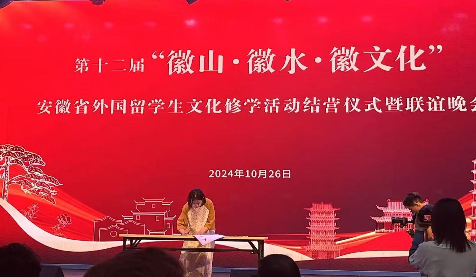 26日,“中国画里乡村”宏村和西溪南古村落迎来了远方的客人,留学生们领略了皖南地区独特的自然与人文景观,陶醉于徽州古村落雾笼白墙灰瓦的诗情画意中。26日晚,第十二届安徽省外国留学生文化修学结营仪式与留学生联谊晚会在黄山学院举行,留学生们载歌载舞,语笑喧阗,掌声不断,共同庆祝此次敞开心扉、结交新知的修学活动顺利举行。我校留学生代表陈金英现场书写了“人间多少佳山水,独许黄山胜太华”的诗词,为我校首次参加此以徽文化为主题,以“山”、“水”为载体,展现大美安徽的留学生文化修学活动画上了圆满句号。