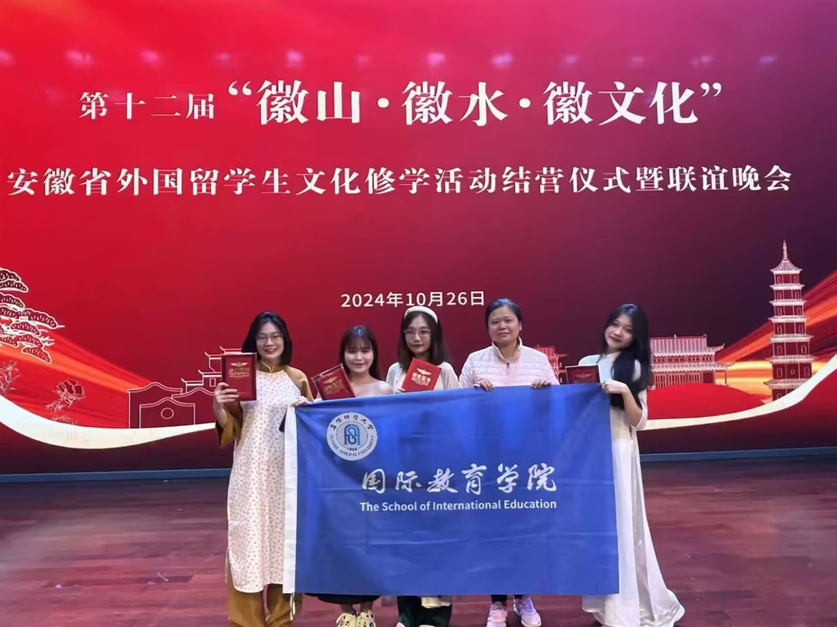 10月24日至27日,我校来自越南的四名留学生参加了以“徽山·徽水·徽文化”为主题的第十二届安徽省外国留学生文化修学活动。此次活动在黄山市举行,由安徽省外国留学生教育管理学会主办、黄山学院与安徽工业大学承办。