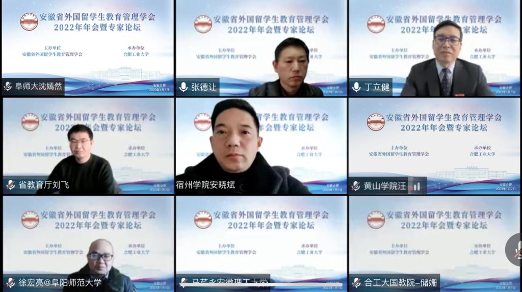 1月7日,由安徽省外国留学生教育管理学会主办、合肥工业大学国际教育学院承办的安徽省外国留学生教育管理学会2022年年会暨专家论坛顺利召开。安徽省教育厅外事处处长姚德勇、合肥工业大学副校长丁立健出席会议并致辞,安徽省外国留学生教育管理学会会长胡健、省内外专家及省内招收来华留学生的院校留学生管理部门负责人、管理干部参加会议。