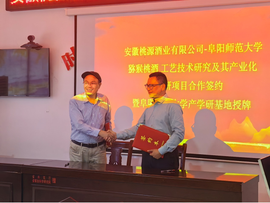 2023年5月30日,在金寨县梅山镇徐冲村会议室,我校功能性果饮生态发酵工程研究中心与金寨县安徽桃源酒业有限公司签署“猕猴桃酒工艺技术研究及其产业化”产学研项目。我校科研处处长张丙开教授、功能性果饮生态发酵工程研究中心负责人兰伟研究员及团队成员、金寨县委副书记刘瀚宇、副县长贺韬、安徽省政府办公厅挂职徐冲村第一书记张源凯、安徽桃源酒业有限公司副董事长廉照才、总经理洪磊及金寨县农业农村局、市场监督管理局等部门负责人出席签约仪式。