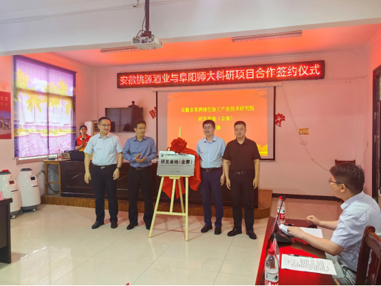 签约仪式上,刘瀚宇代表金寨县委县政府对合作双方表示热烈欢迎,并高度肯定了本次合作对金寨县猕猴桃产业的重要意义。我校张丙开处长代表阜阳师范大学向与会嘉宾介绍了我校及工程研究中心总体情况及产学研开展情况,对本次签约仪式胜利召开表示祝贺。随后兰伟研究员与洪磊总经理签署了“猕猴桃酒工艺技术研究及其产业化”科研项目合作协议,并为阜阳师范大学桃源酒业产学研基地授牌。张丙开处长、刘瀚宇副书记与廉照才副董事长、贺韬副县长共同为安徽省果酒绿色加工产业技术研究院(金寨)研发基地举行揭牌仪式。