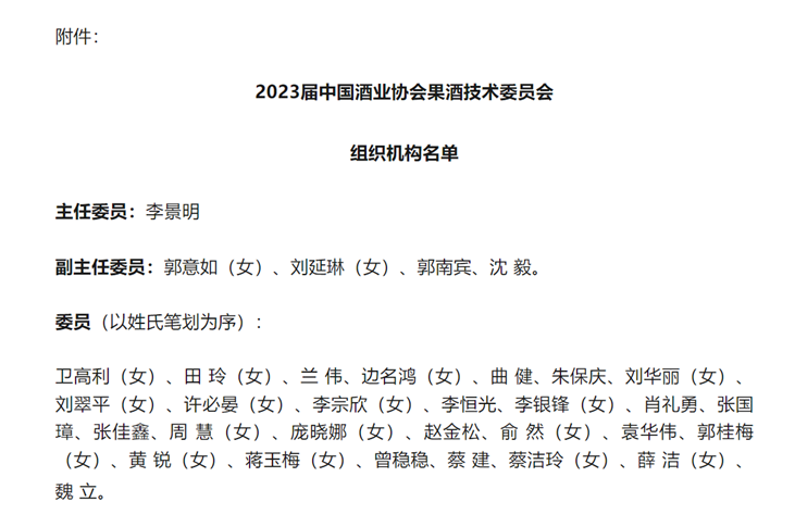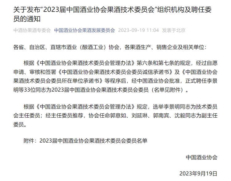 2023年9月19日,经中国酒业协会批准,我中心兰伟研究员当选首届中国酒业协会果酒技术委员会委员。