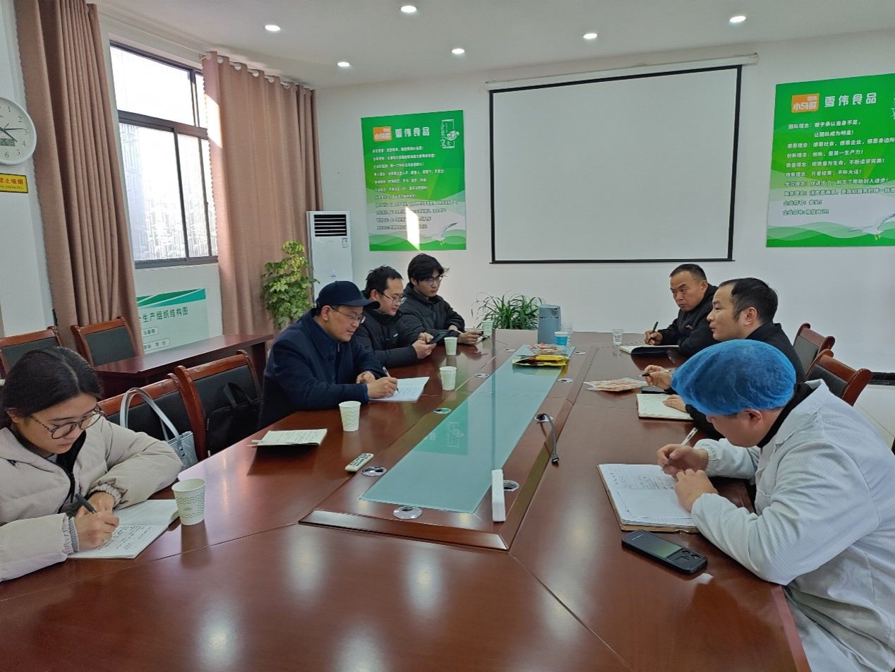 2025年2月26日,我中心兰伟研究员、吴迪迪老师、郭林娜硕士及两位本科生一行赴阜阳市雪伟食品有限公司进行前期合作项目汇报和研讨,阜阳市雪伟食品有限公司厂长李壮热情接待了兰伟一行,随后双方就项目相关事宜展开了深入的交流,旨在进一步推动产学研合作,共同研发满足不同消费者口味的健康辣条。