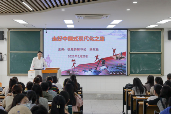 5月25日下午,校党委常委、副书记涂红松深入教学一线,以“走好中国式现代化之路”为题,在西湖校区景行楼401教室为外国语学院2020级英语、日语专业学生上思政课。
