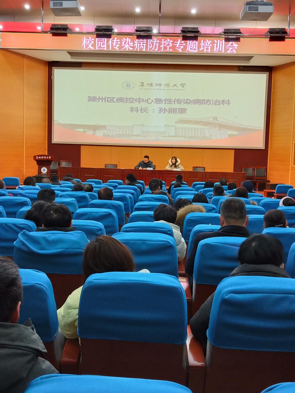 为进一步加强学校疫情防控,认真稳妥、扎实细致做好返校复学工作,确保师生员工的身体健康和生命安全,我校于2月17日下午在西湖校区躬行F楼报告厅组织开展了校园传染病防控专题培训会。我校校医院以及物业、食堂、公寓、经营等教职员工及托管从业人员近50人参加培训。培训会由颍州区疾控中心急性传染病防治科孙丽蒙科长主讲。后勤服务集团总经理高奇志主持培训会并讲话。