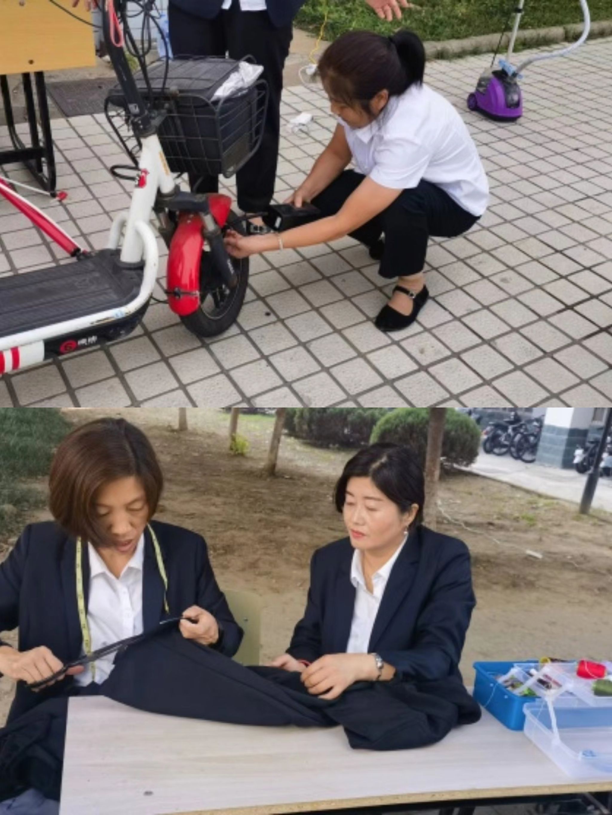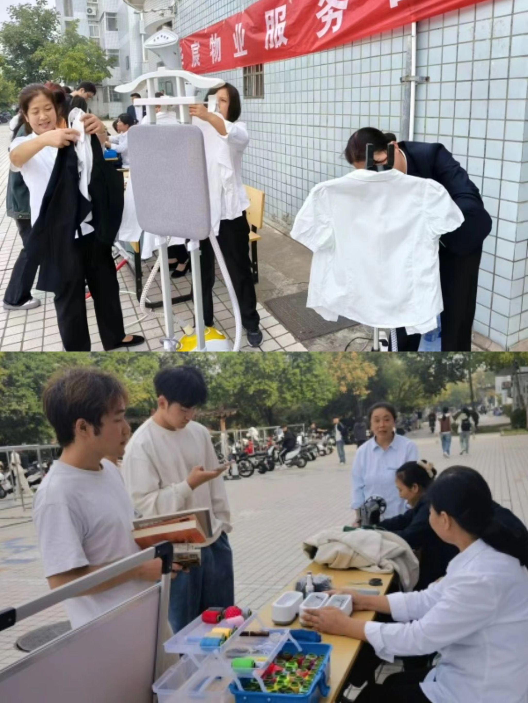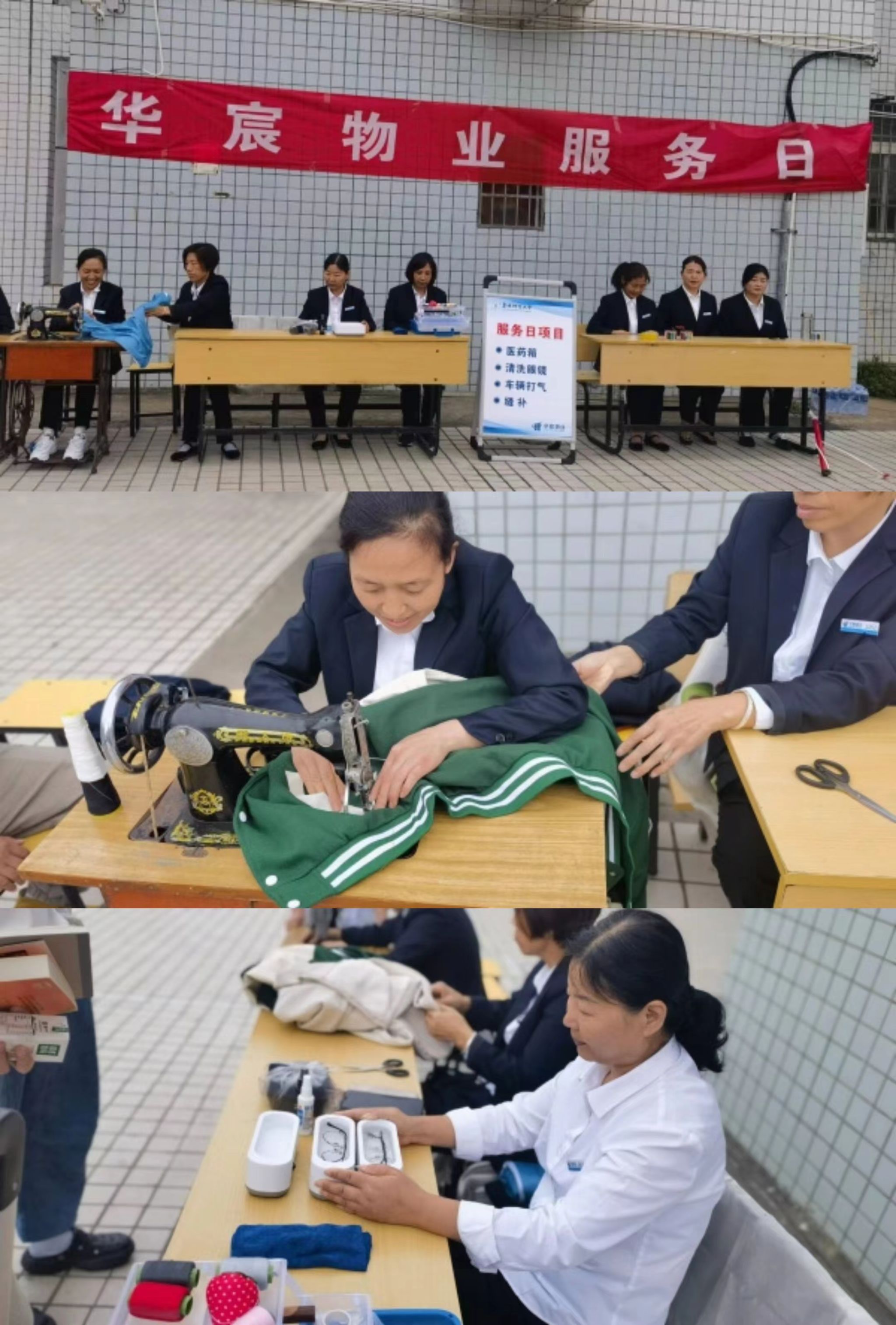 上午8点,宿管阿姨就为活动做好准备,缝纫机、针线包、洗眼镜盒、打气筒、药箱、熨烫机等物品一应俱全。