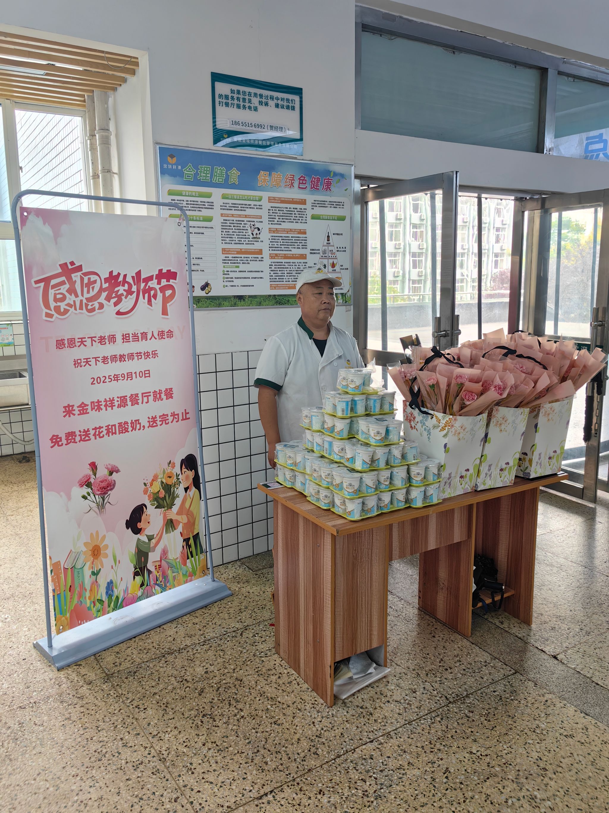 9月10日教师节当天,晨光初照的食堂又换了一番温馨景象 ,入口处整齐摆放着娇艳的康乃馨,搭配 “一朝沐杏雨,一声念师恩”“老师,您辛苦了!” 等节日祝福牌,食堂工作人员化身 “送花使者”,每当有教职工前来就餐,便双手递上包装精美的鲜花,同步道一声 “教师节快乐”。