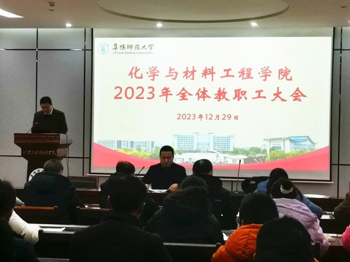 12月29日下午,我院2023年度教职工大会暨工会会员大会在理科综合楼二楼圆形报告厅隆重举行,会议由党委副书记牛贵宏主持,学院党政领导及全体教职工出席。