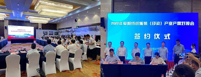 2022年8月27日,阜阳纺织服装(印染)产需对接会在阜南县举行。院长盛良全教授,李慧泉教授,吴福芳博士,苏婷博士参加对接会。