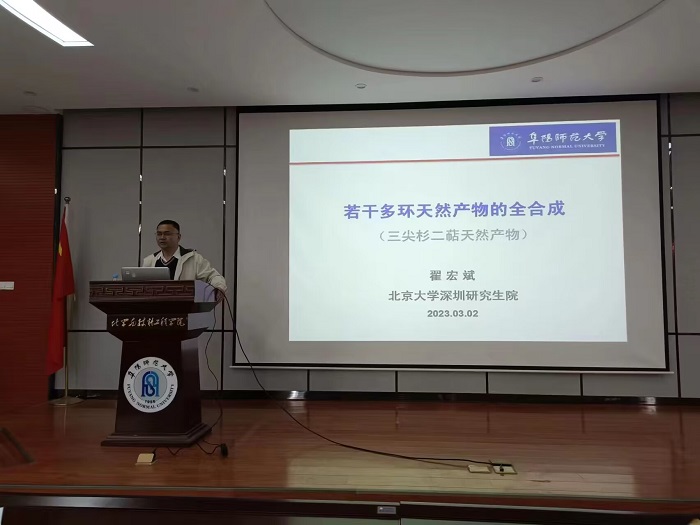 为加强学术交流,3月2日下午,我院安徽省生物质功能性低聚糖工程研究中心,环境污染物降解与监测安徽省重点实验室邀请北京大学深圳研究生院翟宏斌教授到我校作了一场题为“若干多环天然产物的全合成”的学术报告。报告由副院长陈水生教授主持,学院部分师生参加了报告。