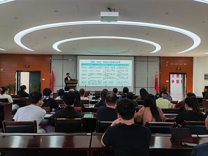汪教授从秸秆“五化”利用技术、当前秸秆利用中存在的问题、高值化利用案例三个方面展开了介绍。汪教授总结出秸秆的肥料化、饲料化、能源化、基料化和原料化技术,比较了各个技术的优势和可能存在的问题,对我院生物质类省级平台科研方向给出了指导性建议。在介绍秸秆的高值化利用时,汪教授从生物炭、食用菌、低聚糖、生物质天然气、生物质有机肥等方面给出了应用案例,表示对生物质资源的高值化利用是皖北地区构建低碳经济的制胜法宝,未来将会有很多潜在的科研课题和经济发展机遇。