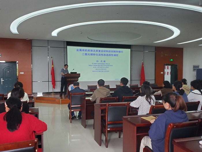 27日上午,孙为银以“金属有机框架及其复合材料的创制和催化二氧化碳转化活性和选择性调控”为题作了学术报告,报告会上,孙为银结合课题组近些年研究成果,并以金属有机框架复合材料的创制和催化二氧化碳转化的研究课题为核心内容,深入浅出地向在场老师和同学们详细阐述该研究课题的研究背景,如何创制金属有机框架复合材料,调控材料的活性位点,从光、电催化转化二氧化碳为高附加值的有机分子。报告会上,孙为银与教师和同学们进行了充分的交流,让大家领会相关领域研究前沿,开拓了学术视野。孙为银鼓励青年教师要敢于挑战科研难题,勉励同学们既要脚踏实地学好专业理论知识,又要敢于创新。