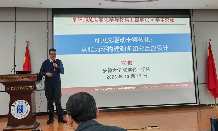 为进一步强化学科建设,提升学院师资与人才培养质量,夯实教师科研水平,拓展学生科研领域视野,12月15日,安徽大学化学化工学院金葆康教授和宣俊教授应邀来到我院,分别开展了题为《时间分辨红外光谱电化学法—理论及应用》和《可见光驱动卡宾转化:从张力环构建到多组分反应设计》的学术报告。学院部分教师、全部研究生及部分本科生参加了此次学术活动,报告会由张宏院长主持。
