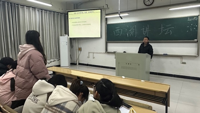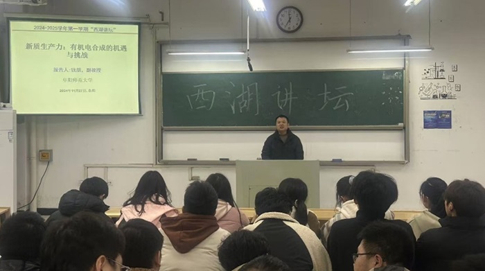 11月27日晚,由科研处主办,我院承办的“西湖讲坛”在西湖校区躬行D楼311教室举行。本期讲坛由学院钱朋副教授主讲,报告题目为“新质生产力:有机电合成的机遇与挑战”,部分老师、研究生和本科生到场交流。
