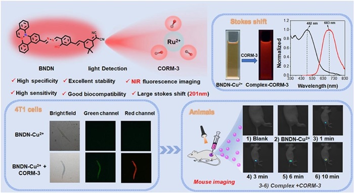 CORM-3是一种具有抗炎和保护心脏功能的水溶性一氧化碳(CO)释放药物分子。CO作为一种内源性气体信号传导分子在人的生理功能中发挥着重要作用。该中心合作合成了一种具有近红外发射的新探针分子,并利用之前提出的由铜离子辅助的策略来识别CORM-3。结果表明,新探针分子具有令人满意的抗干扰能力,而且生物成像表现优异。该研究为进一步深入研究CO的检测提供了新的方法。