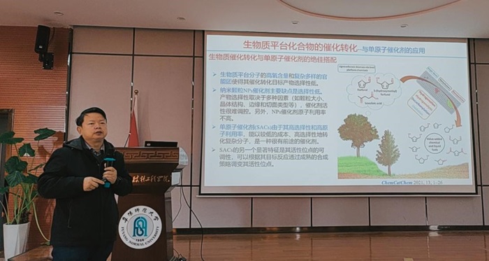 吴玉龙首先介绍了课题的背景及意义;然后举了三个例子,分别是单原子催化剂用于木质素选择性解聚、杂多酸负载原子级分散Pt温和条件下催化木质素加氢脱氧制环烷烃、单原子/纳米颗粒催化剂用于HMF和LA混合物共转化;最后是总结与展望。在互动环节,吴玉龙教授回答了老师和同学提出的问题,针对每个问题提供了详尽而清晰的解答。