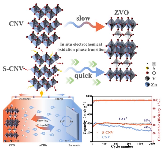 水系锌离子电池(AZIBs)凭借高安全、低成本及环境友好特性,成为下一代储能装置的有力竞争者之一。近期研究发现,低价钒基材料在循环过程中可通过原位氧化相变与锌离子存储形成高度适配,展现出极高比容量。然而,超长的氧化时间和较低的循环寿命严重制约了其商业化应用。