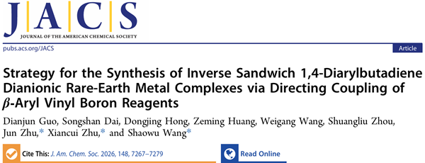 近日,我院青年教师郭殿军博士与安徽工程大学王绍武教授课题组通过紧密合作,首次提出一种以稀土金属单烃基配合物驱动的亲核烯基硼直接偶联反应模式。该项工作以“Strategy for the Synthesis of Inverse Sandwich 1,4-Diarylbutadiene Dianionic Rare-Earth Metal Complexes via Directing Coupling of β-Aryl Vinyl Boron Reagents”为题在中科院一区TOP期刊《Journal of the American Chemical Society》在线发表(J. Am. Chem. Soc. 2026, 148, 7267–7279. DOI: 10.1021/jacs.5c19265)。郭殿军为论文第一作者,安徽工程大学王绍武教授、安徽师范大学朱先翠教授、香港中文大学朱军教授为论文共同通讯作者,我院创新药物研发与产业集成安徽省联合共建学科重点实验室为第二通讯单位。