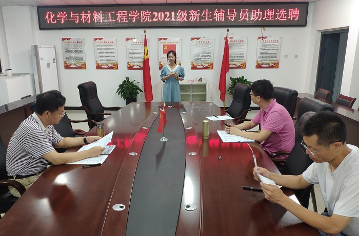 为加强学院学生工作队伍建设,积极引导2021级新生尽快适应大学生活,切实做好2021级新生的思想政治教育和日常管理工作,2021年7月8日,化学与材料工程学院在新化学楼C207会议室开展2021级新生辅导员助理选聘面试考核。学院党委书记马健,辅导员王洪刚、刘静、董淳一担任评委,共有16名2019级学生参加本次辅导员助理竞聘。