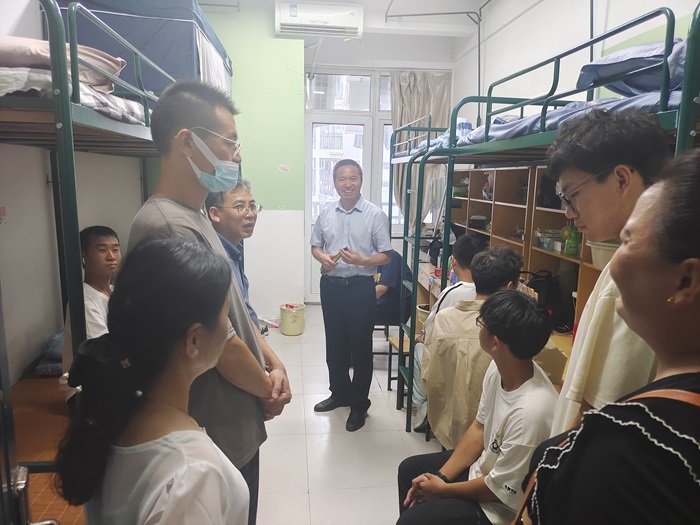 为深入了解学院2024级新生思想动态和学习生活环境,引导新生尽快适应大学校园生活,9月7日下午,我院党委书记牛贵宏、院长张宏带领学院党政班子成员和新生辅导员深入2024级新生宿舍进行走访慰问。
