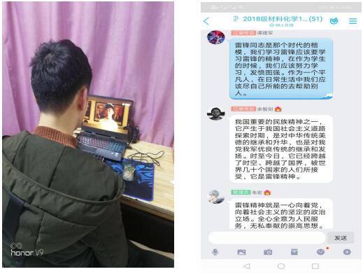 我院各班团支部通过观影、征文、主题团课、实践服务等形式弘扬雷锋精神,传承榜样能量。其中,2017级应用化学2班团支部利用钉钉群开展专题线上主题团课,结合本次新冠肺炎疫情防控工作阐述雷锋精神的时代价值与实践意义,同时针对“作为一名共青团员,在新时代如何学习和弘扬雷锋精神?”进行了深入探讨。2018级材料化学1班团支部通过线上组织观看影片《雷锋的微笑》,带领大家共同回顾青年雷锋的成长历程,之后全体团员依次分享心得感悟,让雷锋精神在传承中熠熠生辉。