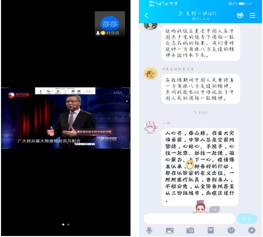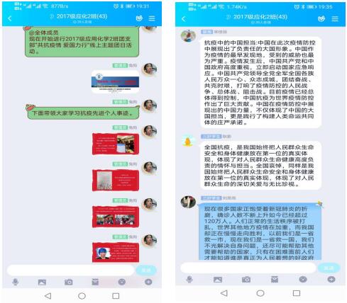 我院各班团支部通过主题团课、专题讨论、观看视频等形式开展本次团日活动。其中,2017级应用化学2班团支部利用班级QQ群开展专题线上主题团课,带领大家深入学习疫情防控一线中涌现出的先进典型事迹,并针对“疫情防控中彰显的中国特色社会主义制度优势”进行了深入探讨。2019级复合材料与工程1班团支部组织线上集中观看《这就是中国》系列节目中的“全球抗疫中的中国力量”,深刻认识中国特色社会主义制度集中力量办大事的巨大制度优势和中国积极践行“人类命运共同体”理念的大国担当。