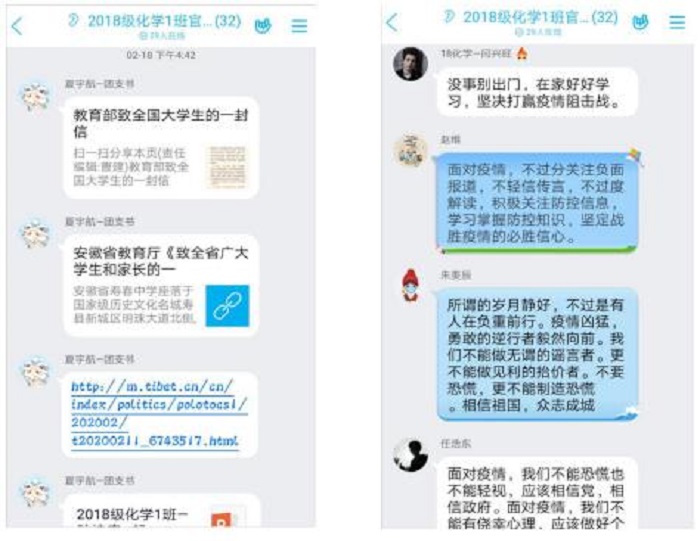 我院各班团支部通过文字、绘画、摄影、视频、志愿活动等形式学习疫情防控知识,宣传防控抗疫精神,弘扬青春正能量。其中,2018级化学1班团支部利用班级QQ群开展疫情防控知识线上专题学习活动,积极引导大家科学理性认识新冠肺炎疫情,同时加强对学校延期开学的宣传。2019级制药工程1班团支部通过线上PPT以图文并茂的形式呈现疫情防控的严峻形势,并积极组织同学们观看新一季青年大学习中防控新冠肺炎特辑,学习如何预防新冠肺炎,坚定战胜疫情的信心。