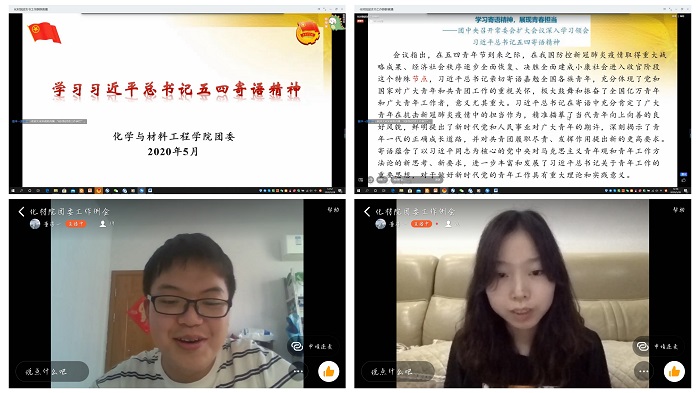 为传承伟大“五四”精神,增强新时代青年的责任与担当。5月28日下午,化学与材料工程学院团委在钉钉群组织学习习近平总书记五四寄语精神。会议由团委负责人董淳一主持,辅导员王艳丽、2017级、2018级、2019级各班团支书出席会议。