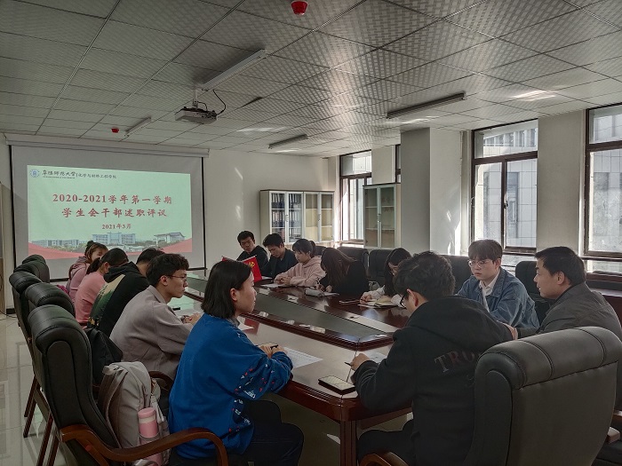 为进一步加强学生干部队伍建设,推进学生会管理工作的规范化、科学化,2021年3月28日,化学与材料工程学院在西湖校区新工科楼C207会议室召开2020-2021学年第一学期学生会干部述职评议会,化学与材料工程学院党委副书记田志坚、院团委负责人董淳一、院团委学生兼职副书记裔洁、孙文博及全体院学生会干部参与本次会议。
