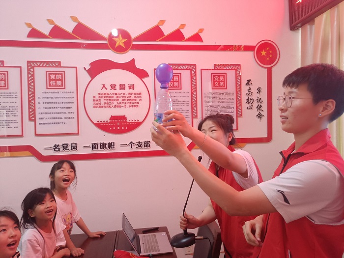实践团成员通过吹泡泡、大象牙膏、简易灭火器、会吹气球的瓶子等趣味化学小实验,寓教于乐,带领在动手实践中认识化学、学习化学、爱上化学。通过诗词课堂,带领小学生们遨游在诗词的海洋,从“会当凌绝顶,一览众山小”赏泰山诸峰,到“飞流直下三千尺,疑是银河落九天”品庐山瀑布,通过诗词课堂,帮助少年儿童真正领悟诗词之美,体悟文学价值。