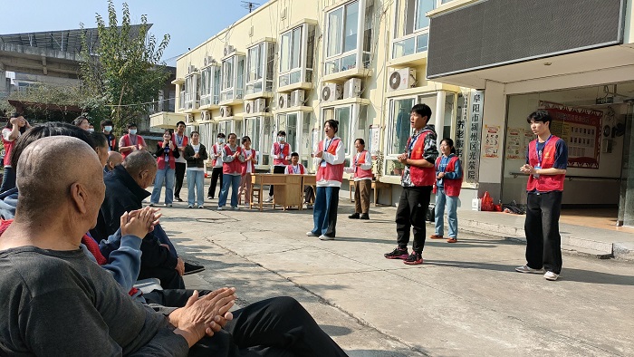 志愿者们带来了血压检测仪为老人们量血压,同时科普生活小常识,为老人们送去秋日关怀。在与老人们沟通交流的过程中,同学们详细了解了老人们的健康状况和生活情况,倾听老人们的生活经历和体验,了解他们的期盼和心声,并积极帮助老人们解决问题与困难。 志愿者们精心准备了歌曲合唱、舞蹈、手势舞等文艺节目。一首经典的合唱《桃花朵朵开》拉开了演出的序幕,舞蹈《勇气大爆发》点燃了现场老人们的热情,也赢得了他们的阵阵掌声。手势舞《感恩的心》、大合唱《强军战歌》等精彩节目接连上演,志愿者与老人们共同度过了充实且美好的一天。