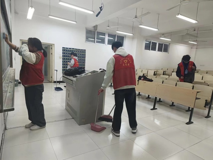 秉持着“劳动光荣,无私奉献”的精神,志愿者们积极响应活动号召。在明确注意事项后,志愿者们分组行动,各司其职,迅速投入到清理工作中。志愿者们拿扫把、拖把、抹布等清洁工具,对教室黑板、地面、桌椅进行彻底清扫,做到及时发现、及时处理、不留死角、不留痕迹。在志愿者们的默契配合与辛苦清理之下,教室里窗明几净,桌椅和黑板纤尘不染。