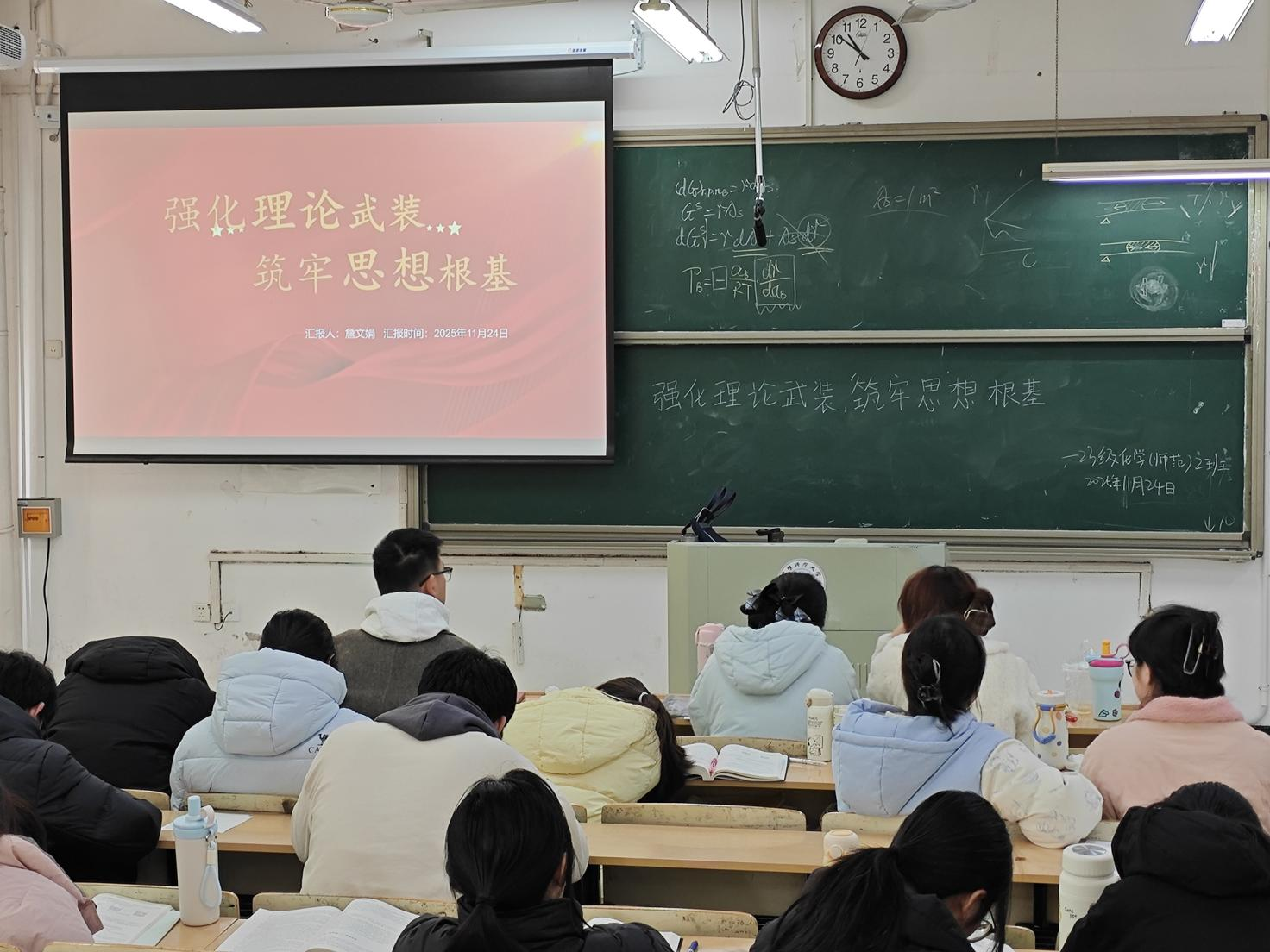 2023级化学(师范)2班团支部以“强化理论武装 筑牢思想根基”为主题,通过系统解读新时代理论体系、结合师范专业分享先进教育工作者的思想实践案例,引导青年团员深刻理解理论学习的现实意义,将思想认同转化为专业学习的动力,以扎实的理论素养和坚定的理想信念,为未来投身教育事业、传递思想火种筑牢根基。