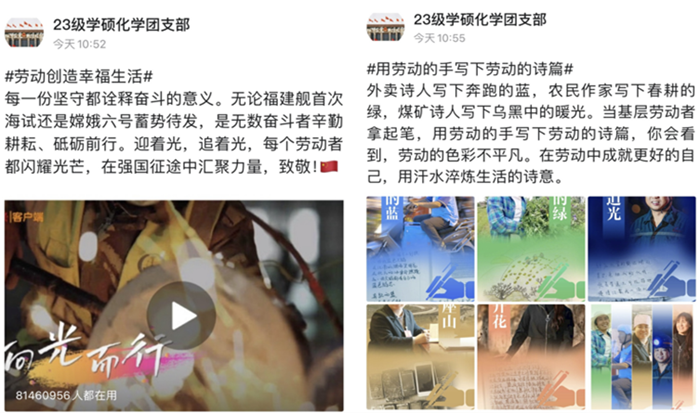 为教育引导研究生同学树立“劳动最光荣、劳动最崇高、劳动最伟大、劳动最美丽”的观念,养成崇尚劳动,主动劳动的良好习惯,培育勤俭节约、艰苦奋斗、创新实干、敬业奉献的劳动精神,推进以劳树德、以劳增智、以劳强体、以劳育美,引导全社会树立“以辛勤劳动为荣,以好逸恶劳为耻”的价值追求,弘扬劳动光荣、创造伟大的时代风尚。2023级研究生化学1班团支部积极响应上级号召,于5月6日至5月12日,组织开展了“劳动创造幸福生活”的劳动教育系列活动。