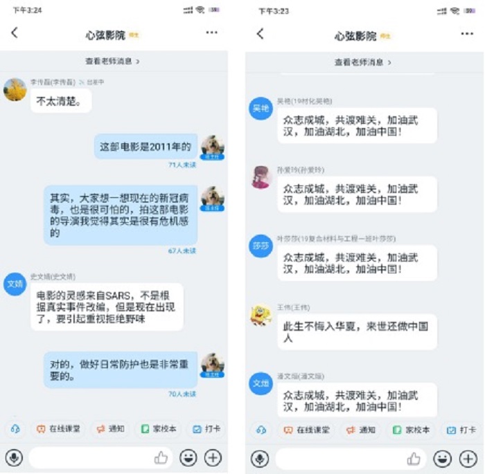 活动伊始,院心联组织同学们在钉钉群共同观看电影《传染病》,影片中主要讲述了一种新型致命病毒在几天之内席卷全球的故事,结合当前蔓延全球的新冠肺炎疫情,发人深思。随后,同学们在钉钉群结合个人感悟分享观后感,大家踊跃发言,畅谈加强个人防护的重要性,表达对祖国母亲的深深祝福。