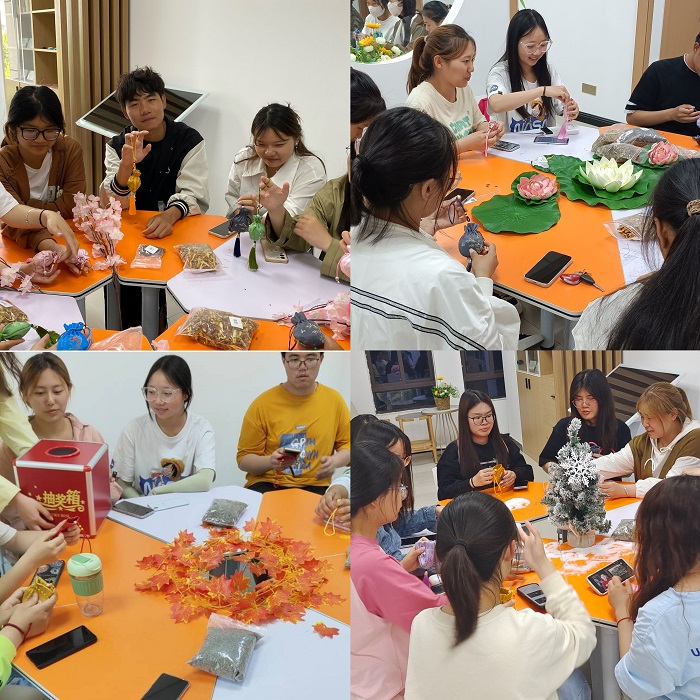 活动包括“春暖花开”、“长夏蝉鸣”、“桂馥兰香”、“踏雪寻梅”四季主题香囊制作活动,此次活动吸引了多个学院的学生参加。活动现场经过精心布置,营造出四季不同景观,对比强烈,让人耳目一新。伴随着优美的旋律,主持人详细介绍了手工香囊的文化、起源、意义及用途,引导同学们近距离接触和辨别香料,并为同学们讲解了不同香料的作用。随后,在主持人指导下,同学们亲自把香料装入香囊。活动过程中,同学们专心致志、沉心静气,获得了心灵的平静。