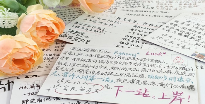 志愿者们在精心挑选的贺卡上用暖心的文字和灵动的色彩,一笔一画描绘下对学长学姐们真切的祝福和期望。志愿者们热情的加油与祝福宛如冬日里的暖阳,给备考的学长和学姐们带来了“研”途的温暖。