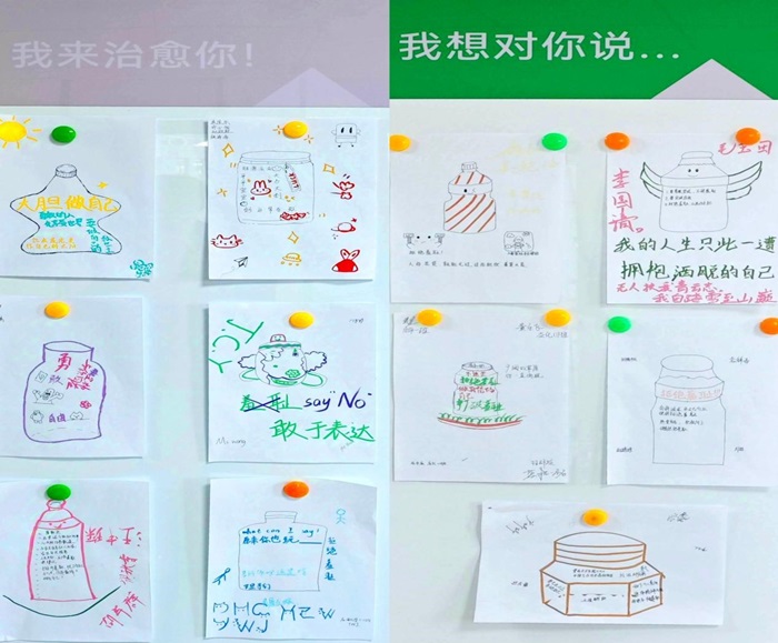 活动现场,气氛热烈,同学们积极参与互动,掌声连连。活动尾声,学生们拿起画笔,绘制了创意十足的心理能量瓶,既寄托了对未来的美好愿景,又彰显了拒绝内耗、接纳自己、拥抱自信的坚定信念。